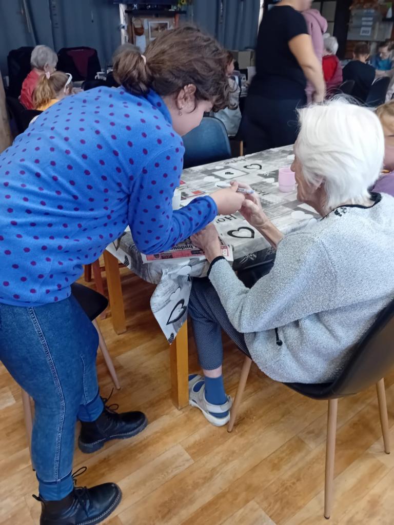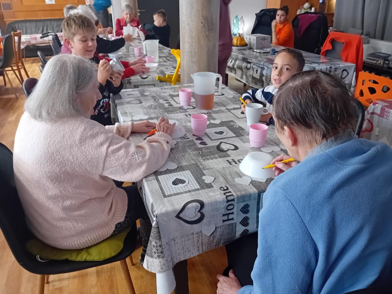 Děti se seniory kreslily na hrnky , mističky a kamínky. Dětské výrobky byly jako dárek seniorům.